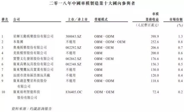 智通财经了解到,自从奇士达从新三板摘牌之后,奇士达就成为了车模行业最大的非上市私人企业。同时是2018年前十大市场参与者中,唯一以OBM、ODM及OEM模式制造并持有全面ICTI认证的市场参与者。2018年的收入2.79亿元。