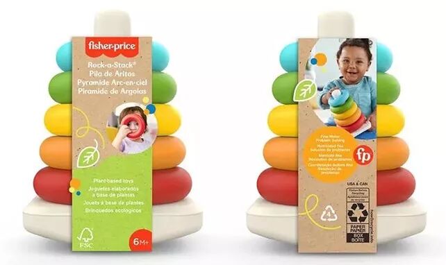 美泰公司宣布到2030年,其产品和包装全部使用可持续材料,明年将推出一款以来自于甘蔗的植物基塑料为原料制成的新版费雪彩虹套圈(Rock-a-Stack)。