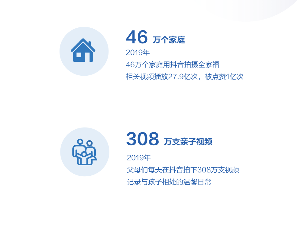 近期,抖音发布《2019年抖音数据报告》,透露其日活跃用户已经于2020年1月5日超过4亿。其中,2019年,抖音短视频APP吸引46万个家庭用抖音拍摄全家福,相关视频播放27.9亿次,被点赞1亿次。同时,广大的父母为记录与孩子相处的温馨日常拍下了308万支亲子短视频。
