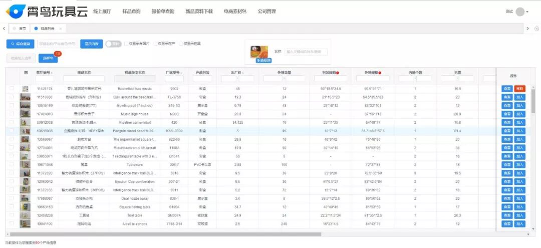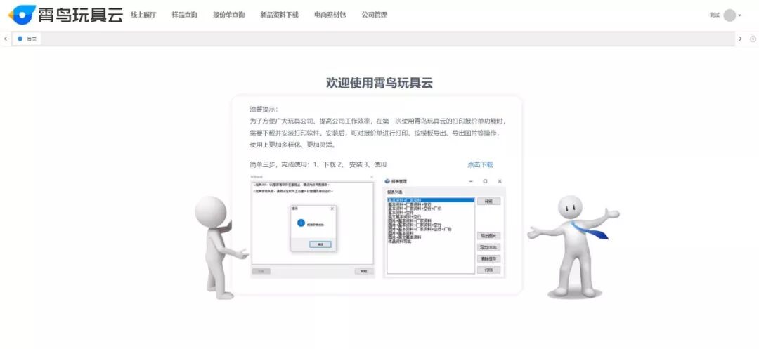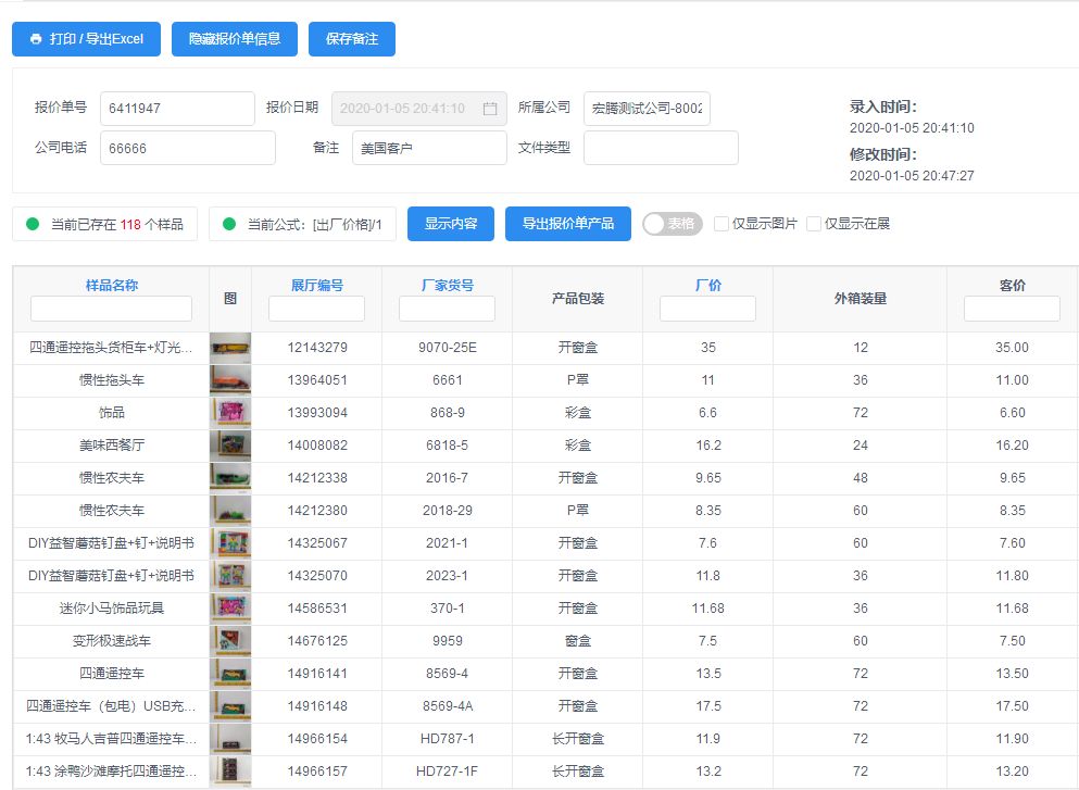 贸易公司带客户来宏腾展厅挑选样品,霄鸟玩具云会实时根据客户挑选的样品生成一份报价单,贸易公司登陆霄鸟玩具云就可以查看及下载和打印报价单,大大提升工作效率。