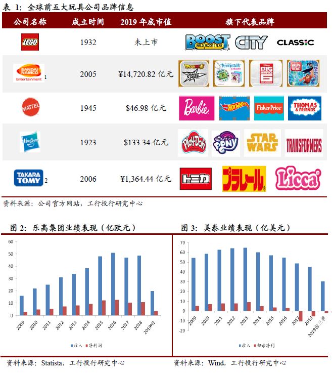 从公司层面看,英国著名品牌价值评估顾问公司Brand Finance公布的2019全球最有价值的玩具品牌中,乐高(Lego丹麦)、万代南梦宫(Bandai Namco日本,股票代码7832.T)、美泰(Mattel美国,股票代码MAT.O)、孩之宝(Hasbro美国,股票代码HAS.O)和多美(Takara Tomy日本,股票代码7867.T)五大公司包揽了排名前25的所有品牌,占全球玩具行业中占据明显优势。