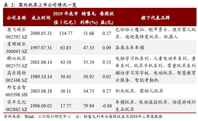 从公司看,目前我国有7家以玩具为主业的上市公司,分别为奥飞娱乐、星辉娱乐、群兴玩具、高乐股份、邦宝益智和实丰文化。与海外知名玩具公司动辄50年以上的历史相比,国内公司仍较为年轻,成立年限多在20-30年。