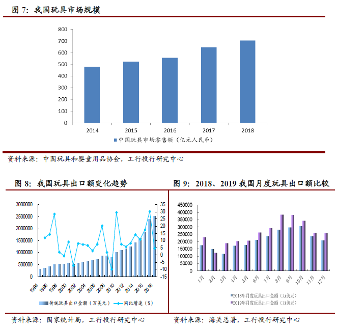 据中国玩具和婴童用品协会发布数据,2018年我国玩具市场规模约为704.8亿元人民币,同比增长约9%。除已成为全球第二大玩具消费国,我国还是全球最大的玩具出口国,欧美市场80%以上玩具均为中国制造。2019年,我国玩具出口金额313.42亿美元,同比增长21.99%,远高于我国货物出口的总增速。从出口国看,2019年前十个月,我国传统玩具对美国出口同比增长3.65%,对欧盟增长28.62%、对东盟增长66.37%、对中东增长28.38%、对拉美增长16.35%,对大洋洲增长16.50%。美国市场占中国玩具的出口份额从2018年前十个月的35.32%占比下降至2019年同期的31.20%。