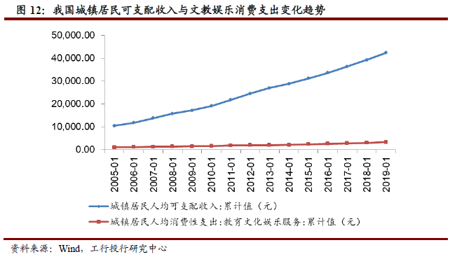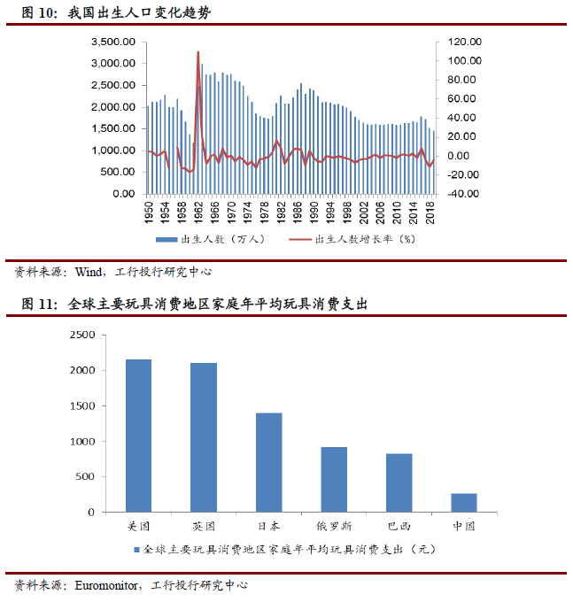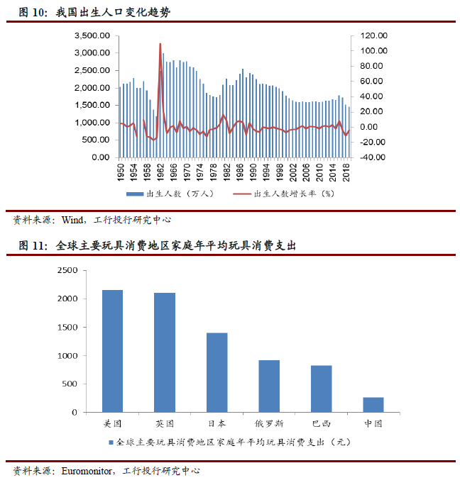 从消费意愿和能力看,家庭玩具消费有所增长,但仍有较大提升空间。我国城镇居民用于教育文化娱乐服务的支出自2016年以来基本保持年均8.33%的增速,其中2019年较2018年同比增长11.9%,高于同期城镇居民可支配收入的同比增速(7.92%)。同时我国家庭平均玩具消费支出水平不仅与英、美、日相距悬殊,与巴西、俄罗斯等国相比也存在不小差距。