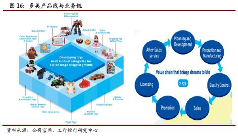 玩具公司的IP主要由两个途径获取,一是自主研发,二是通过授权获取。IP授权玩具通过将玩具与消费者喜爱的IP内容有机结合,能够持续吸引消费者为其中的文化形象买单。在全球市场中,授权玩具销售额不断上升。2019年我国玩具零售额中,IP授权玩具占比18.4%,较2018年增加0.5个百分点。需要关注的是,尽管通过IP授权方式来获取品牌开发价值能减少公司自主研发的成本和风险,但也面对授权费用高、具有使用不确定性的问题。从长远看,自主品牌创新才是国内玩具企业提升竞争实力,能够与海外大厂同台竞技的关键。一款有特色有新意的产品可能在未来数年甚至数十年为公司带来丰厚收入。而通过对玩具IP的开发,也可进一步撬动其衍生价值和企业利润空间。