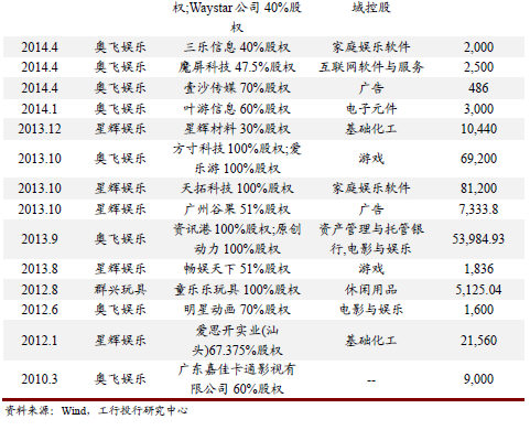 根据Wind统计数据显示,2010年以来,国内共发生39笔涉及玩具企业的投资并购事件,其中表现较为活跃的有上市公司奥飞娱乐和星辉娱乐、群兴玩具。通过对这三家公司发展策略和业绩表现的分析可以看到,在外延并购时,玩具企业还应优先选择与主业相关度较高,宜发挥协同效应的领域进行切入,避免盲目扩张对企业的主业运营造成不利影响。