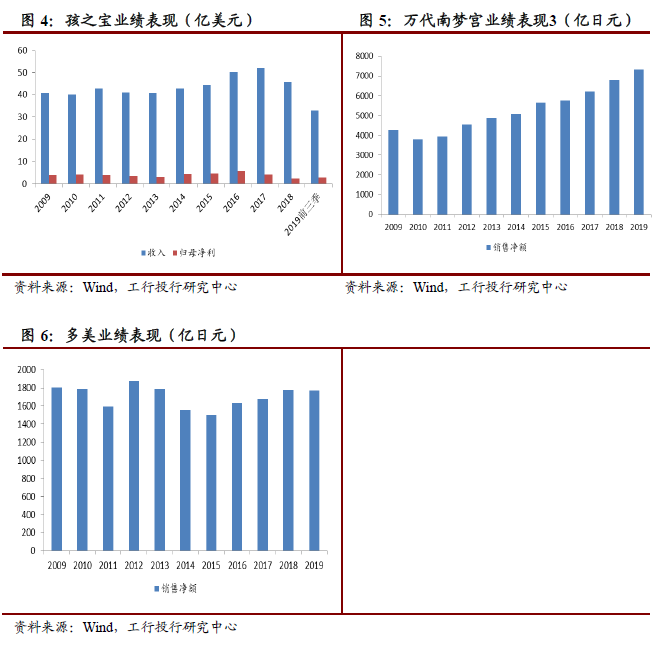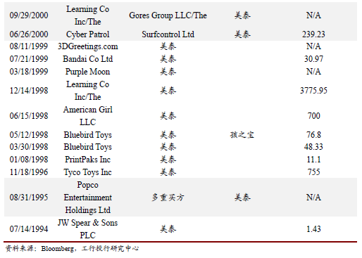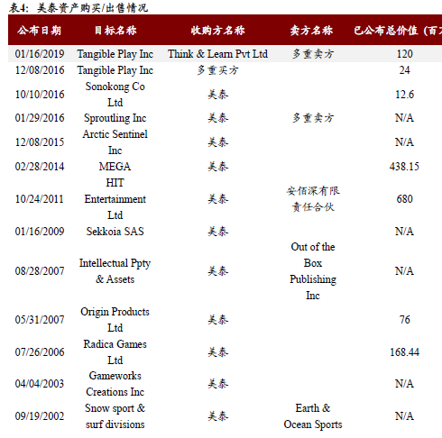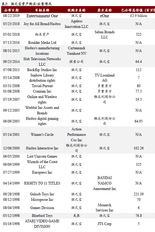 美国孩之宝公司自1994年以来公司完成的资产购买与出售多达30笔,涉及游戏公司、玩具公司、动漫/游戏版权等。美国另一玩具巨头美泰则在同一时期内完成了26笔投资、收购与资产出售,其中包括玩具公司、教育科技公司、儿童节目制作公司等,其收购的知名品牌包括火车头托马斯、美高积木、火柴盒(车模)、桌游UNO等。而日本目前最大的两家玩具公司万代南梦宫和多美均是公司合并的产物。其中前者是由日本游戏公司南梦宫和日本最大的综合性娱乐公司万代在2005年合并而成,希望实现游戏和玩具领域的互补效应,以度过行业的不景气时期。后者则是由两家玩具公司——原多美公司和TAKARA公司在2006年合并而成,亦是希望通过合并实现强强联合。