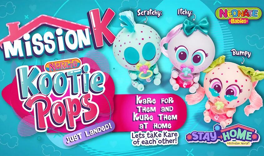 Distroller公司的Nerlie Kootie Pops娃娃产品,被假定为罹患某种疾病的外星婴儿,孩子们通过精心照顾,可以让婴儿娃娃得以痊愈。针对新冠疫情,该公司推出了三款娃娃新品,并发起Mission K活动,该活动提倡健康的生活习惯,并为孩子和家庭提供了一系列资源,包括免费下载和可打印的应对新冠疫情的内容,如:如何正确洗手等。