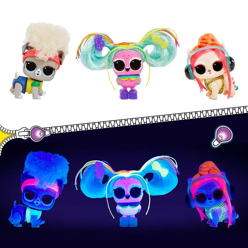 L.O.L.惊喜娃娃之霓虹宠物,一层层揭开宠物身上的毛发,露出它们的造型与特征,在光线较暗的地方,用包装内附带的小灯配件照射宠物,可以发现它们隐藏的炫彩霓虹效果。此外,变换使用冷水与温水,把宠物放入水中,还可发现宠物们的随机变色功能。