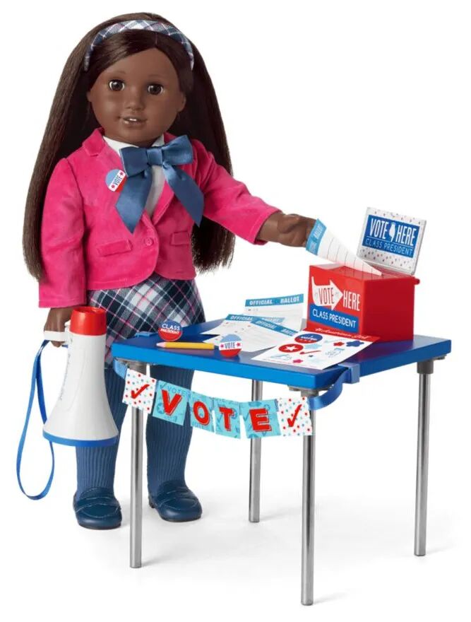 美国女孩推出“真正的我”学生会选举套装,教育孩子投票的重要性。黑皮肤的美国娃娃搭配投票箱、喇叭、横幅等投票装备,在对孩子们进行公民基本权利启蒙的同时,也让他们意识到黑人也应和白人一样拥有同等的选举和被选举权。