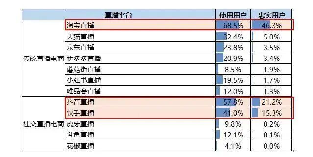 据中国消费者协会发布的《直播电商购物消费者满意度在线调查报告》显示,今年1-3月中, 使用淘宝直播的用户遥遥领先,占比68.5%,忠实用户也高达46.3%,其次是天猫直播、京东直播和拼多多直播,但和淘宝直播都不是一个量级。 另一类直播平台中,抖音直播和快手直播属于第一梯队,用户占比分别是57.8%和41.0%,远远高于虎牙、斗鱼、花椒直播。