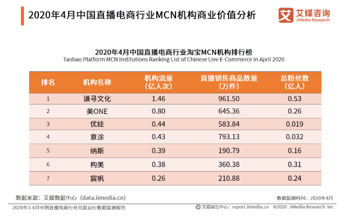 3) MCN机构,还有一些玩具、婴童用品企业在刚开始做直播电商时会考虑与一些MCN机构合作,希望能借此了解直播电商这一新兴领域。这些MCN机构拥有丰富的主播资源和平台流量资源,艾媒咨询也就此作出调研,从今年4月直播电商行业MCN机构商业价值分析数据表明:分别拥有薇娅和李佳琦的谦寻文化、美ONE,2020年4月,其机构流量分别达到1.46亿人次及0.80亿人次,牢牢占据机构排行榜前两位。而意涂、纳斯等机构同样拥有自身的头部主播,在直播电商行业也占据了自己的一席之地。