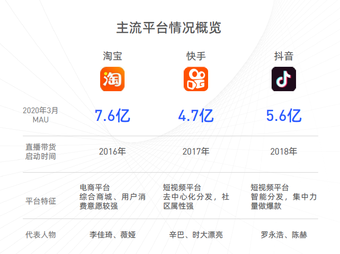 新榜研究院发布的《2020直播生态研究报告》显示:2020年3月,直播电商3大主流直播平台分别为淘宝、快手、抖音,最早启动直播电商的淘宝居于首位。