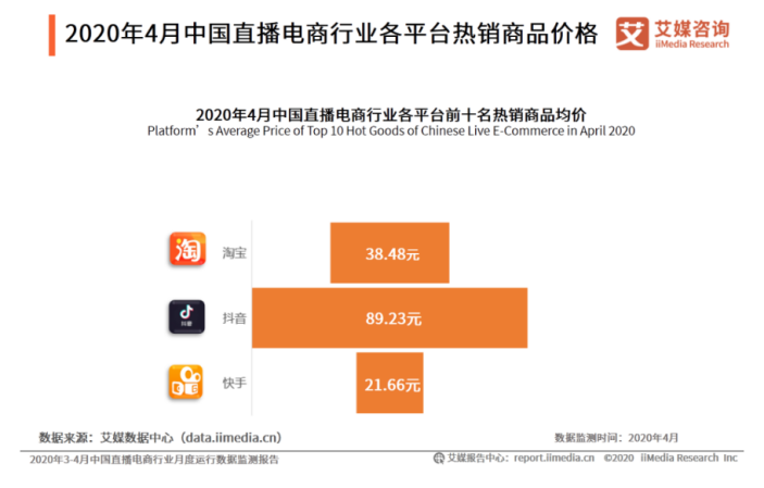据艾媒咨询发布的2020年4月中国直播电商行业各平台前十名热销商品均价,抖音为89.23元、淘宝为38.48元、快手为21.66元,依照此数据,玩具及婴童用品企业在直播电商选品时,可以重点考虑价格区间为20-90元左右的产品。