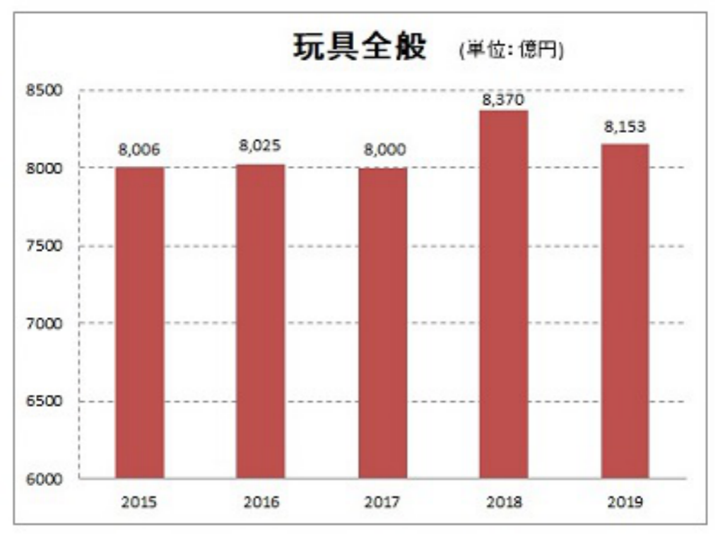 到2019年,玩具市场规模虽有小幅度下降,但也站稳了8000亿日元的关口。