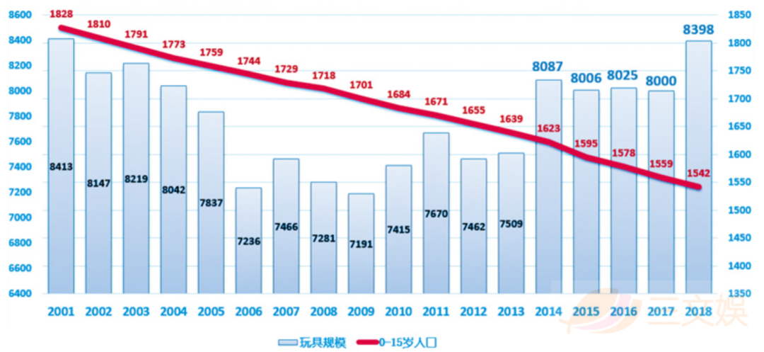 但生育率的下降和玩具市场规模的变化并非成正比。比如,2001年至2018年,18年里日本的0-15岁人口从呈直线下降,但2018年玩具市场的规模却迎来了一个峰值——增长到了8398亿日元。