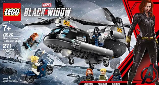 乐高集团的“黑寡妇直升机追捕”套装,孩子们可以拼搭模仿大师的直升机,包括旋转的旋翼叶片、一个开放的驾驶舱,和一个模仿大师的人仔,货物区打开后,可以看到模仿大师的小车,套装还包括伊莲娜·贝洛娃和黑寡妇的小人仔和摩托车。