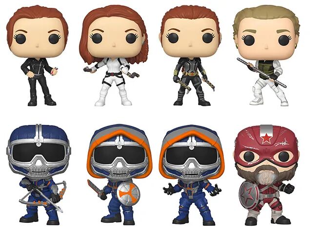 Funko推出黑寡妇POP塑胶人偶,包括身着便装和白色套装的黑寡妇、拿着盾牌和弓箭的模仿大师及红色守护者、叶莲娜·等。