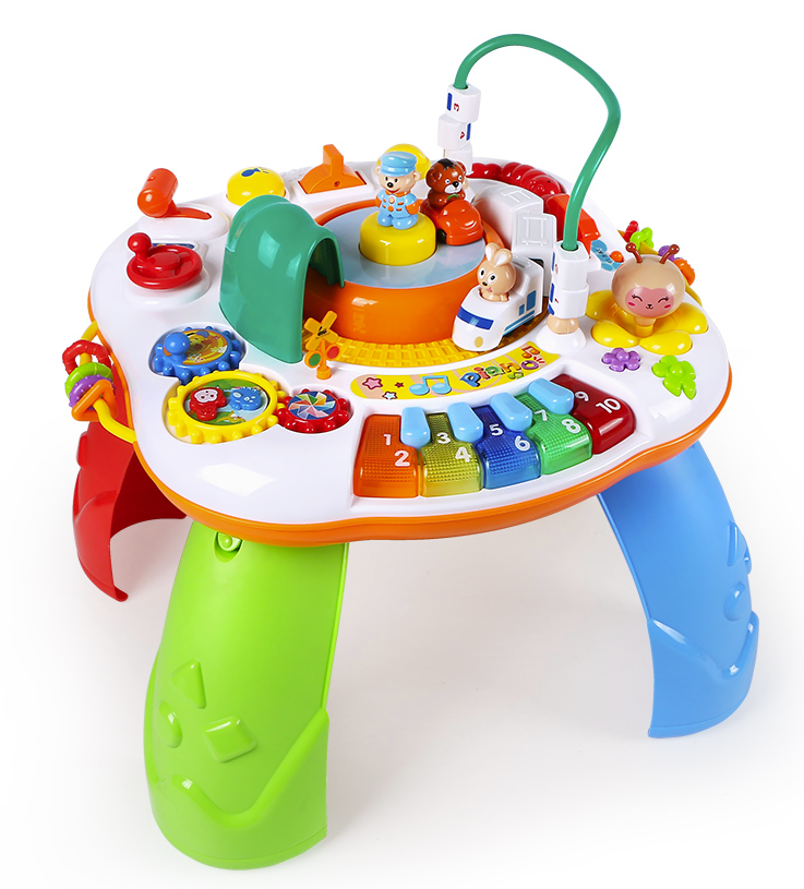 这款游戏桌集合了钢琴键、数字串珠、齿轮联动、旋转小列车等多种功能,玩法多样,多个按钮或对应不同功能或发出不同声效,丰富的互动环节设置,带来多重趣味。