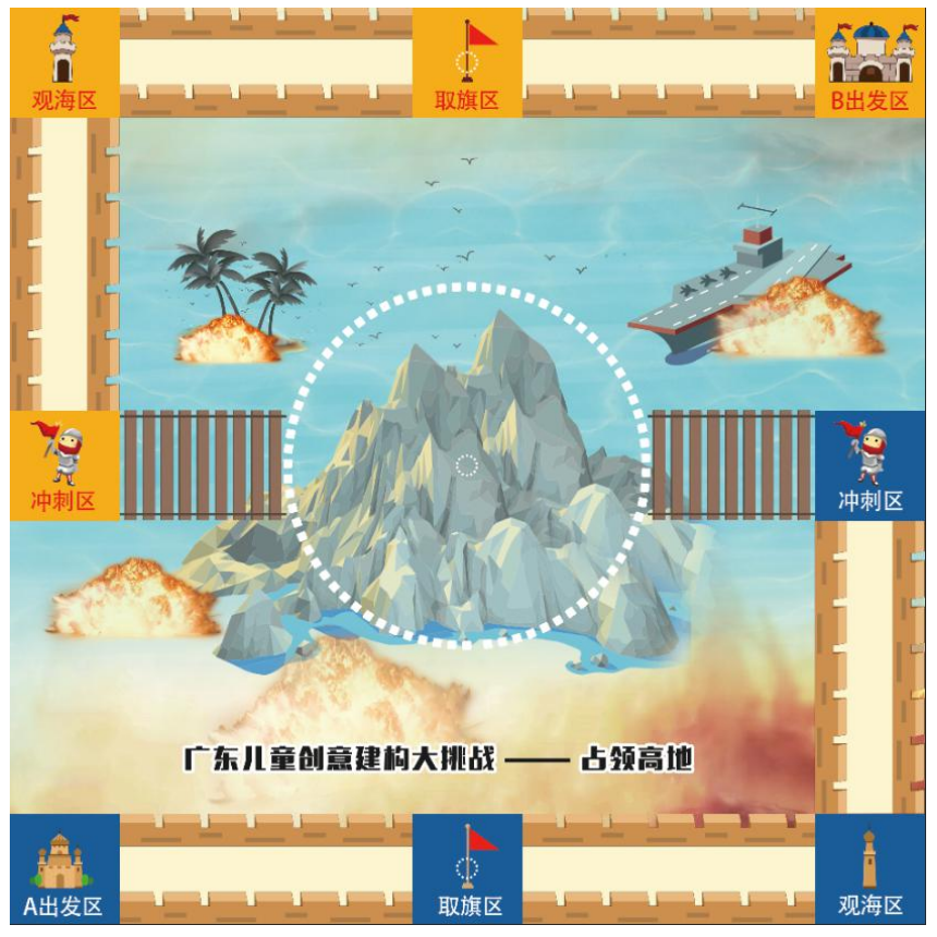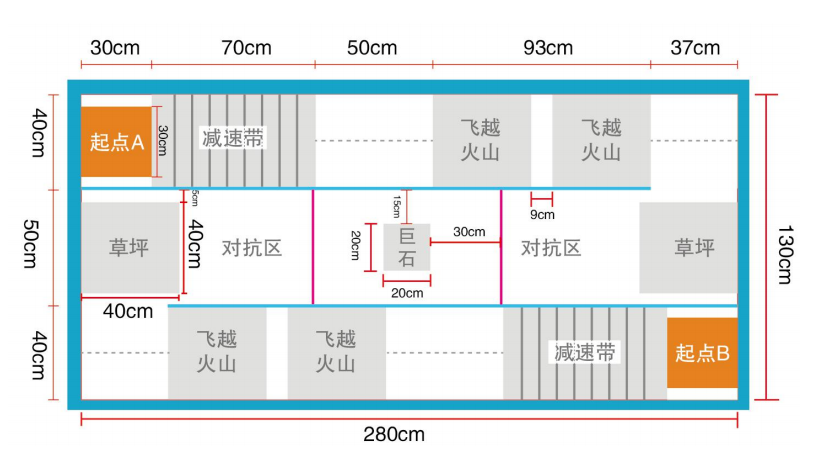 选出1位队员操控小车,和另一队小车争先完成各个任务,在限定时间内到达顶峰插上战旗。